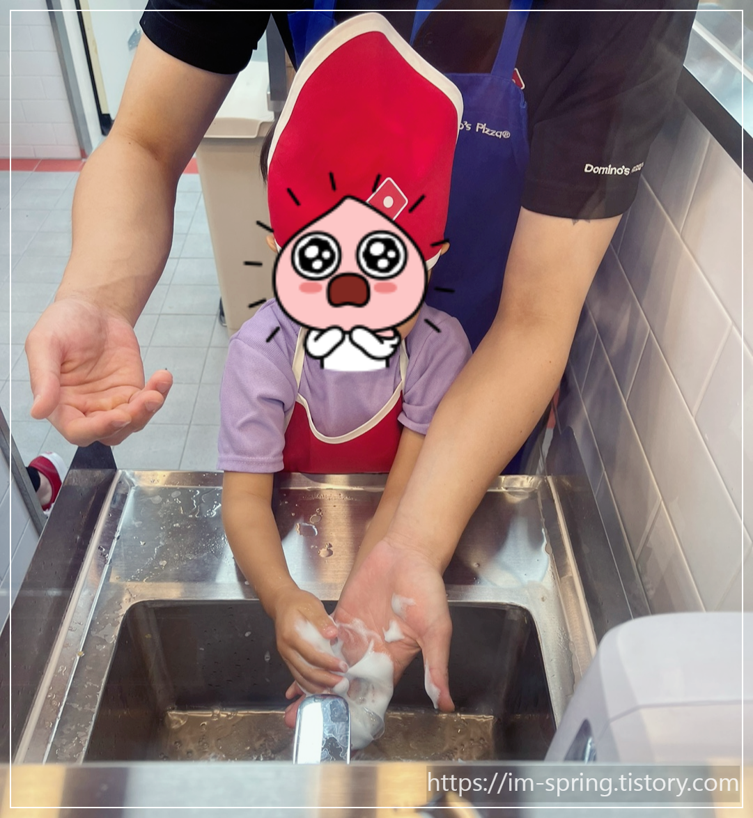 우선, 도착하자마자 도미노피자 앞치마세트로 깔끔하게 단장하고, 음식을 만들기전에 손도 깨끗이 씻었어요,