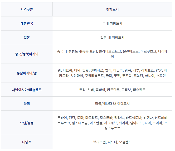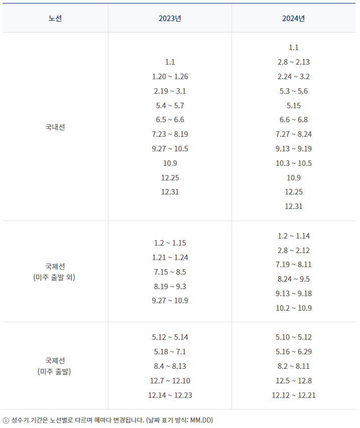 - 대한민국을 경유하는 해외지역 간 여정의 경우, 각 여정 첫 구간의 탑승일자 기준으로 성수기가 적용됩니다.