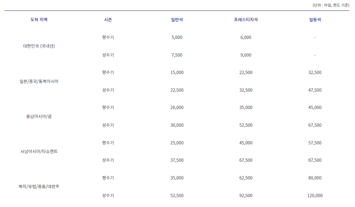 - 성수기에는 평수기보다 더 많은 마일리지가 공제됩니다.