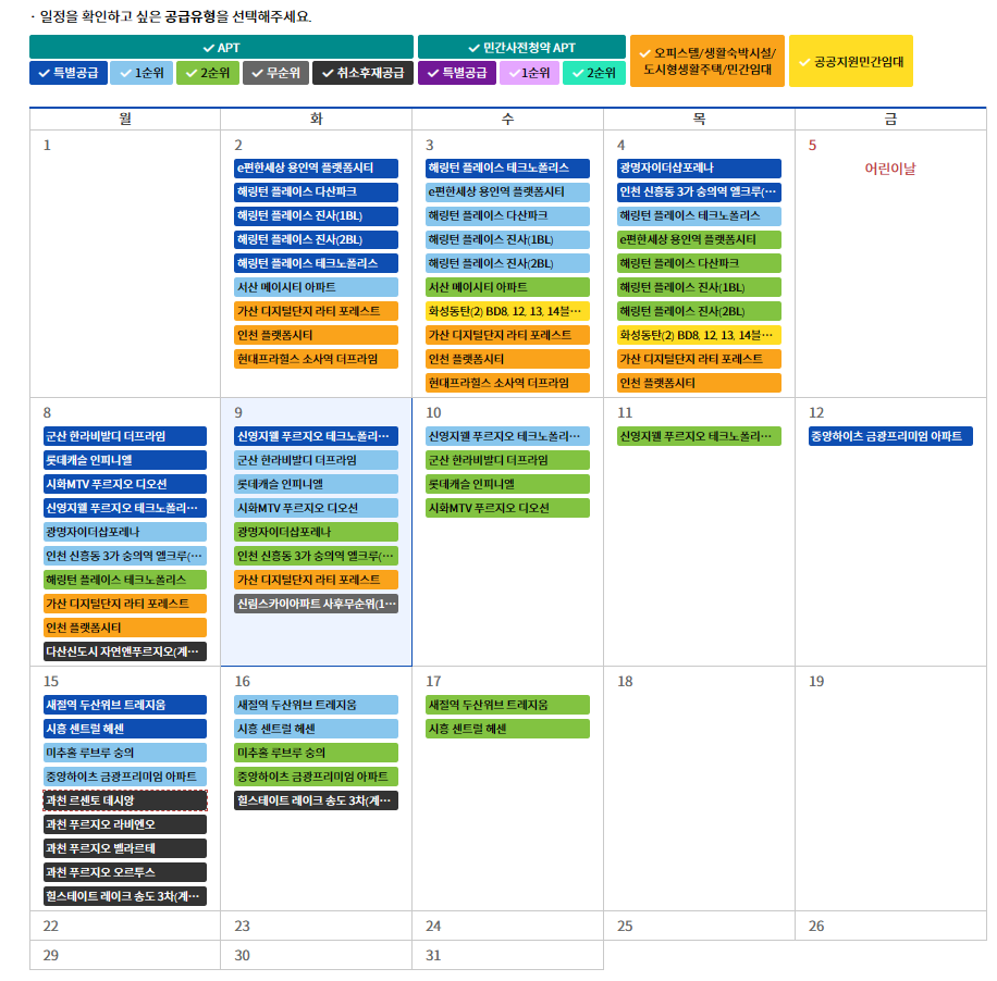 청약캘린더를 보면, 5월 15일에 검정색으로 과천 줍줍건을 확인할 수 있어요.