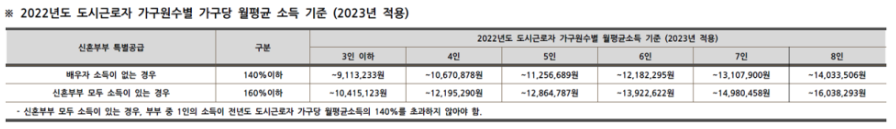 소득기준은 전년도 기준 외벌이 140%, 맞벌이 160%이고, 자산기준은 3억 3100만원 이하입니다.