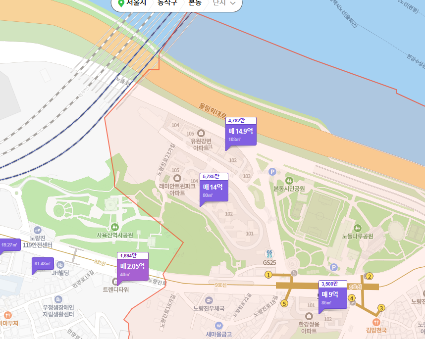한강 앞 + 올림픽대로 + 지하철 1/9호선(노량진역과 노들섬역) 이예요.