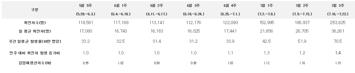 7월 3주(7.16.~7.22.) 주간 신규 확진자는 253,825명으로 전주 대비 35.8% 증가하였음